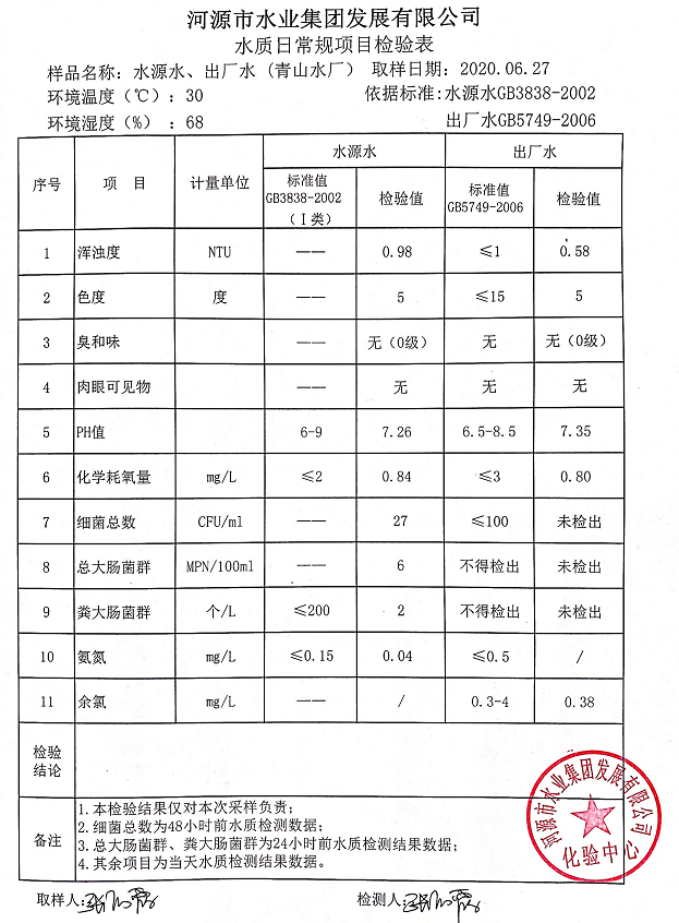 2020年6月27日水質(zhì)檢驗報告