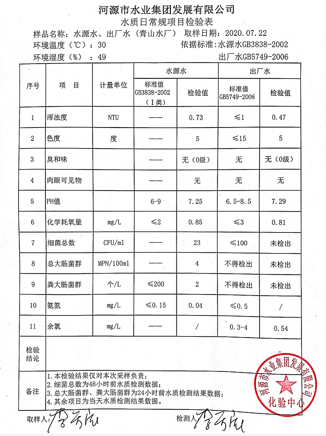 2020年7月22日水質(zhì)檢驗報告