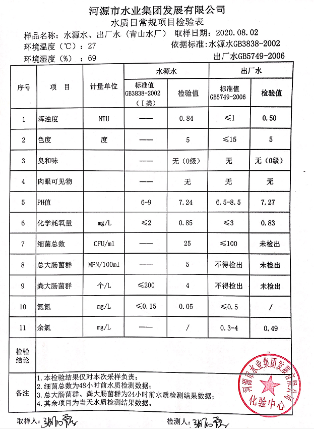 2020年8月2日水質(zhì)檢驗報告
