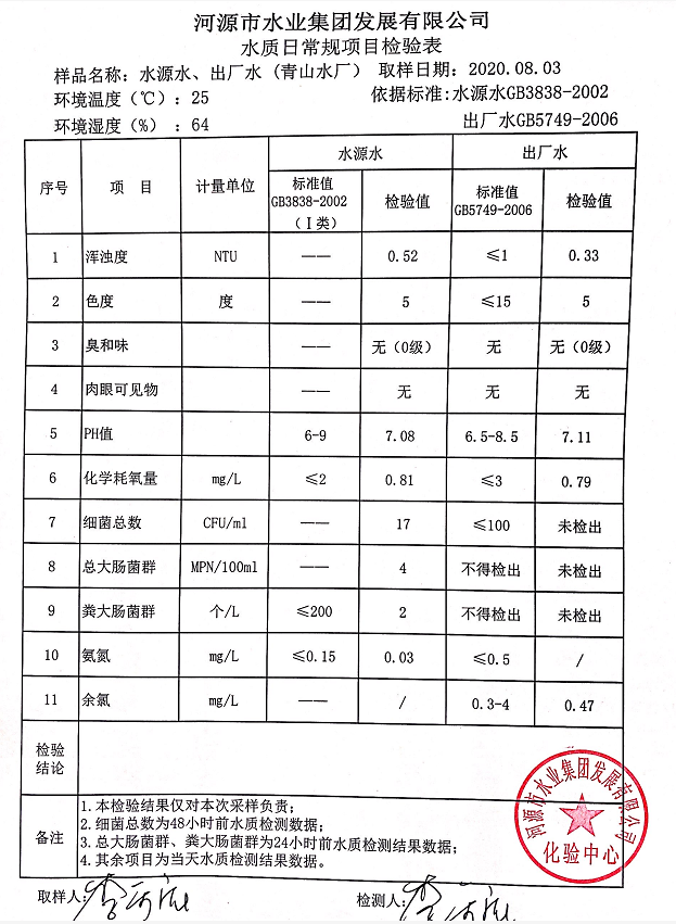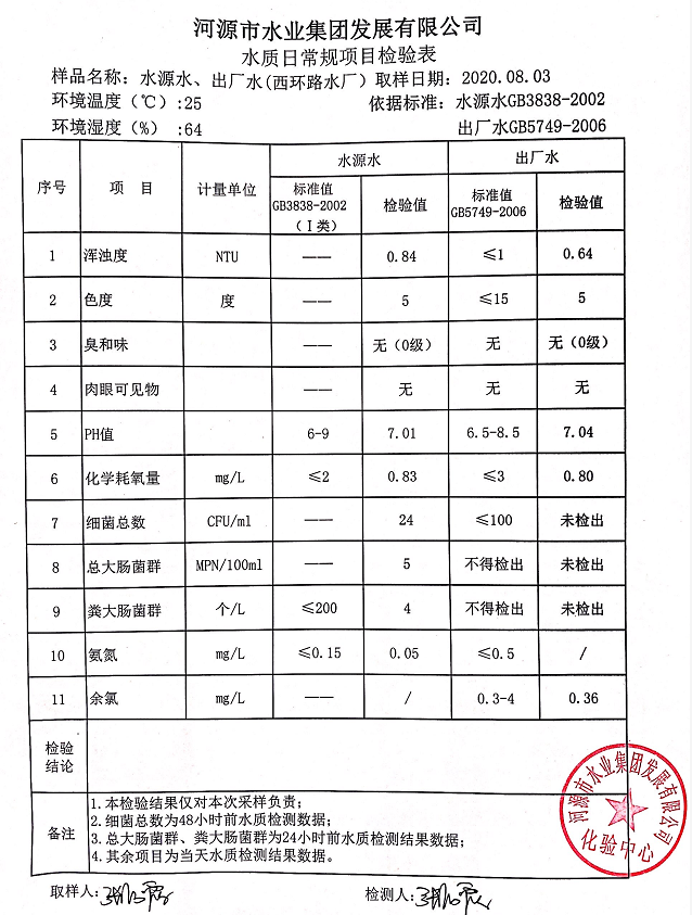 2020年8月3日水質(zhì)檢驗報告