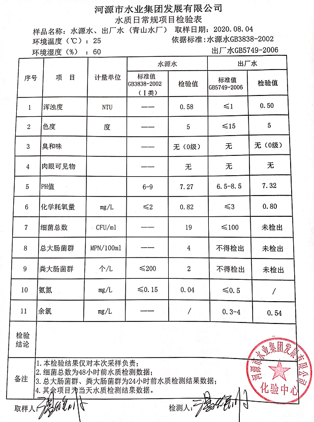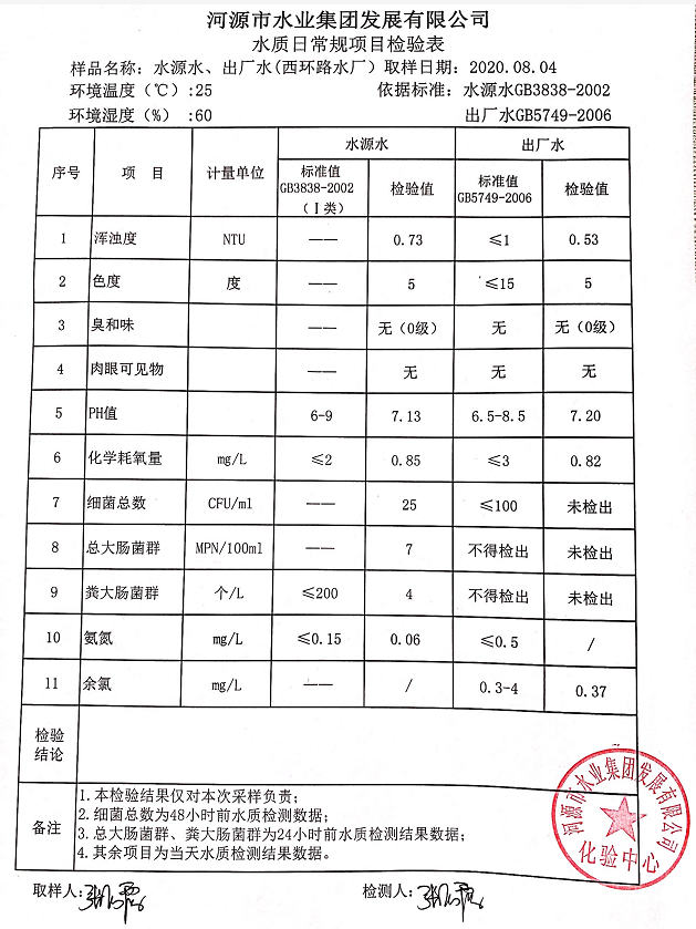 2020年8月4日水質(zhì)檢驗報告