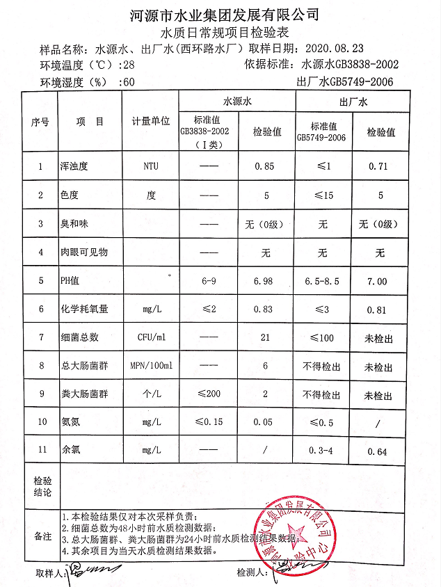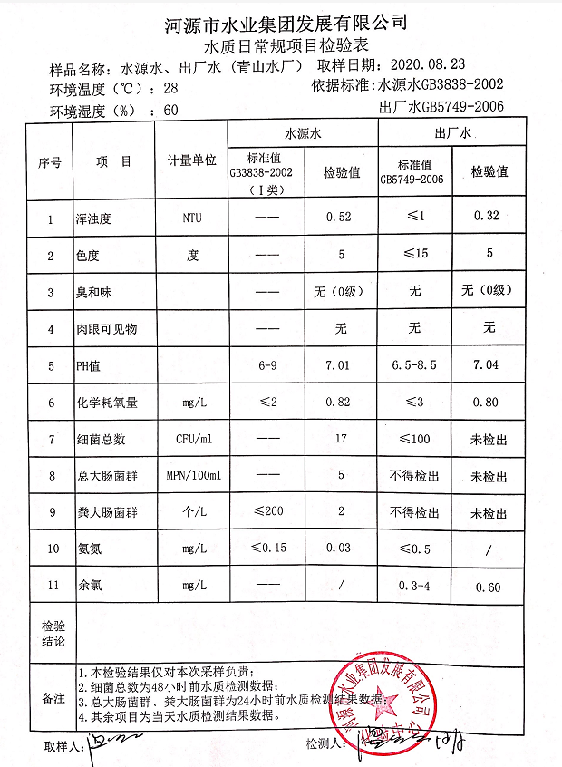 2020年8月23日水質(zhì)檢驗報告