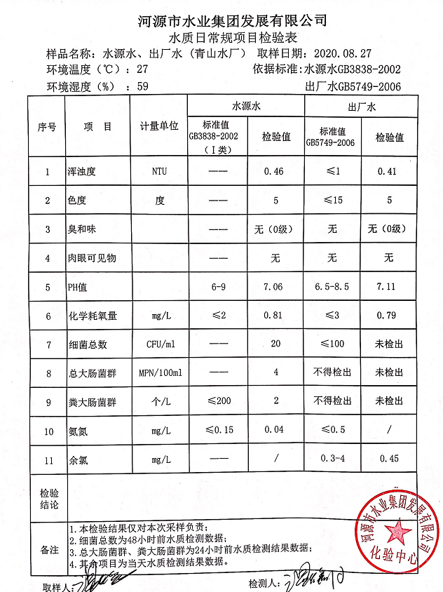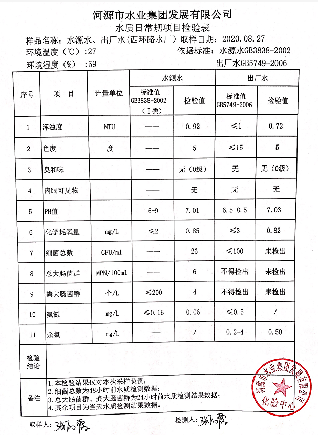 2020年8月27日水質(zhì)檢驗報告