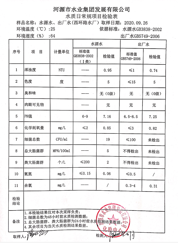 2020年9月26日水質(zhì)檢驗報告