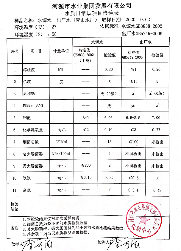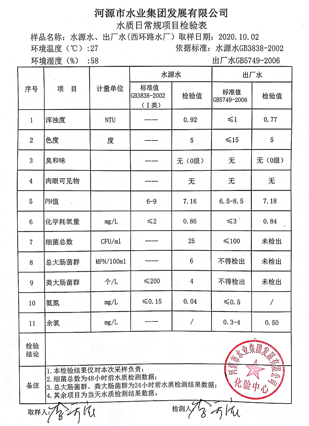 2020年10月2日水質(zhì)檢驗報告