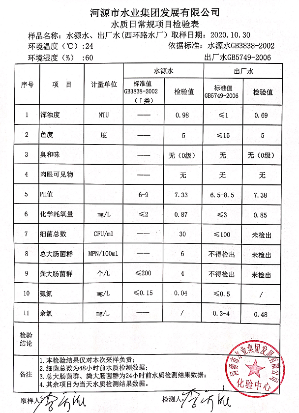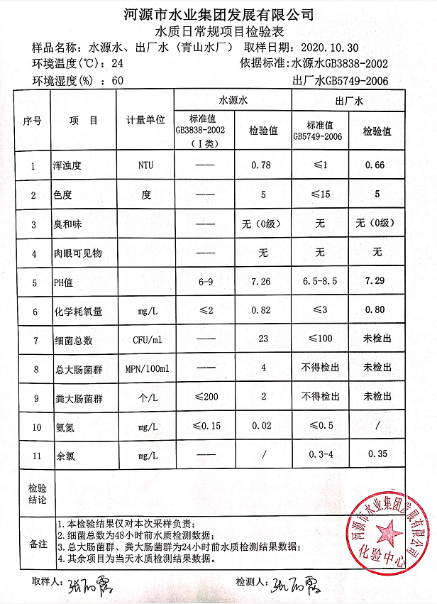 2020年10月30日水質(zhì)檢驗報告