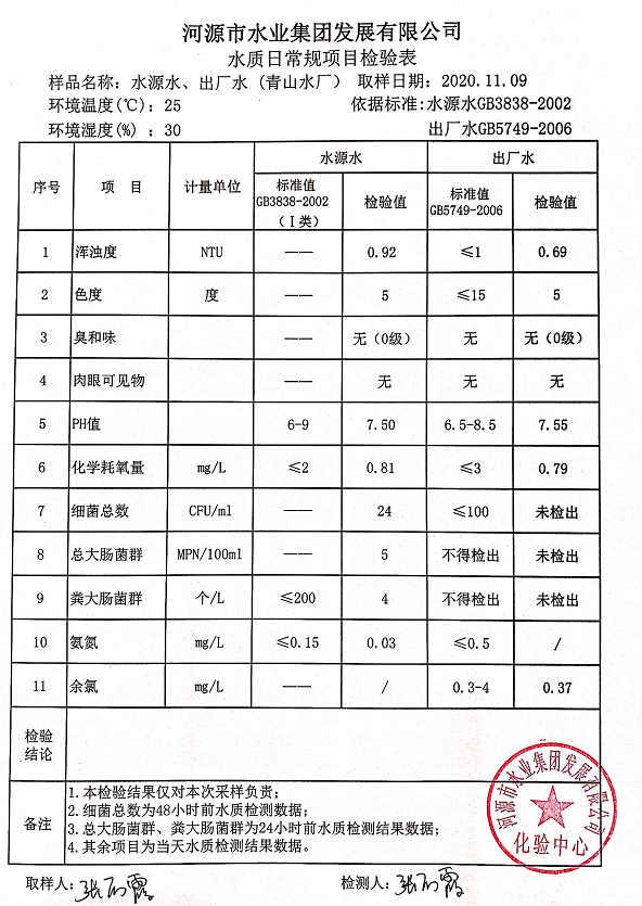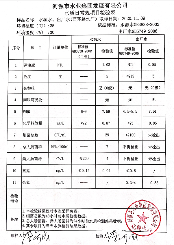 2020年11月9日水質(zhì)檢驗報告