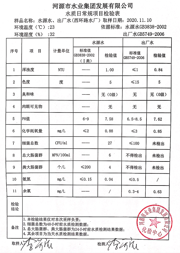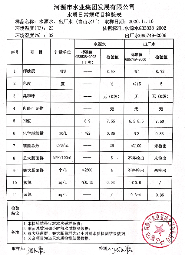 2020年11月10日水質(zhì)檢驗報告