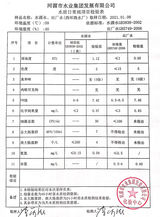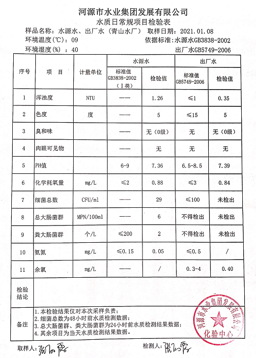 2021年1月8日水質(zhì)檢驗報告