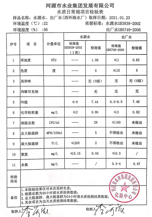 2021年1月23日水質(zhì)檢驗報告