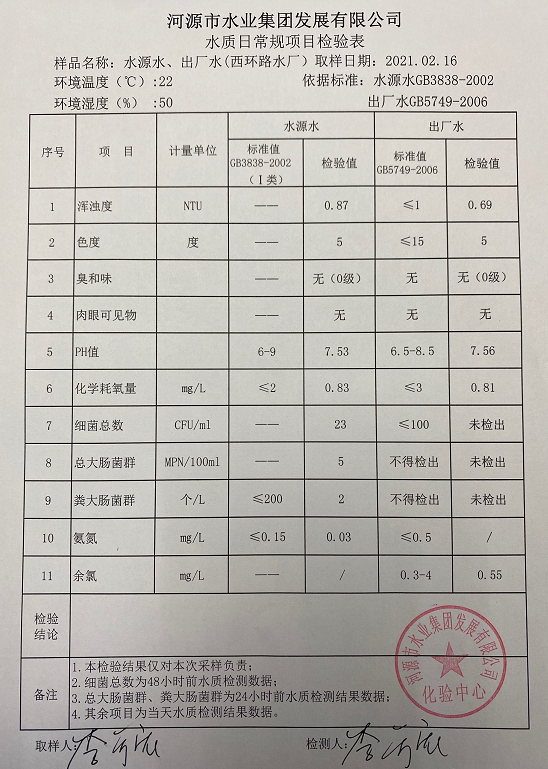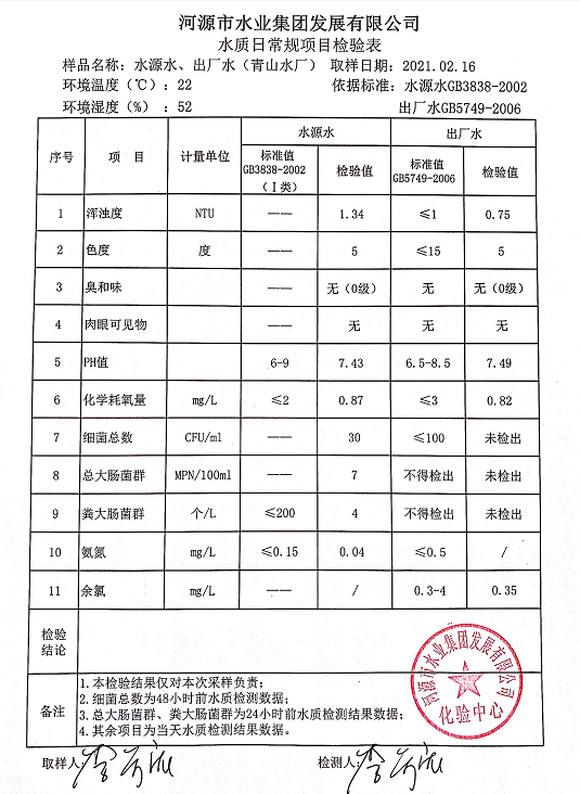 2021年2月16日水質(zhì)檢驗報告