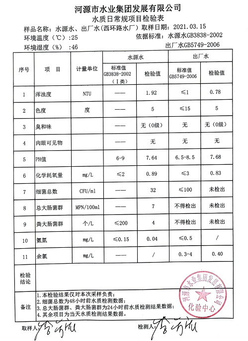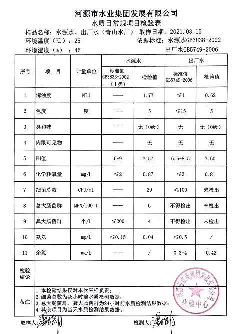 2021年3月15日水質(zhì)檢驗報告