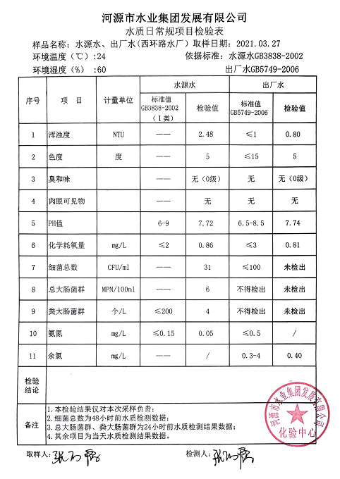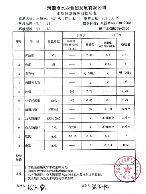 2021年3月27日水質(zhì)檢驗報告