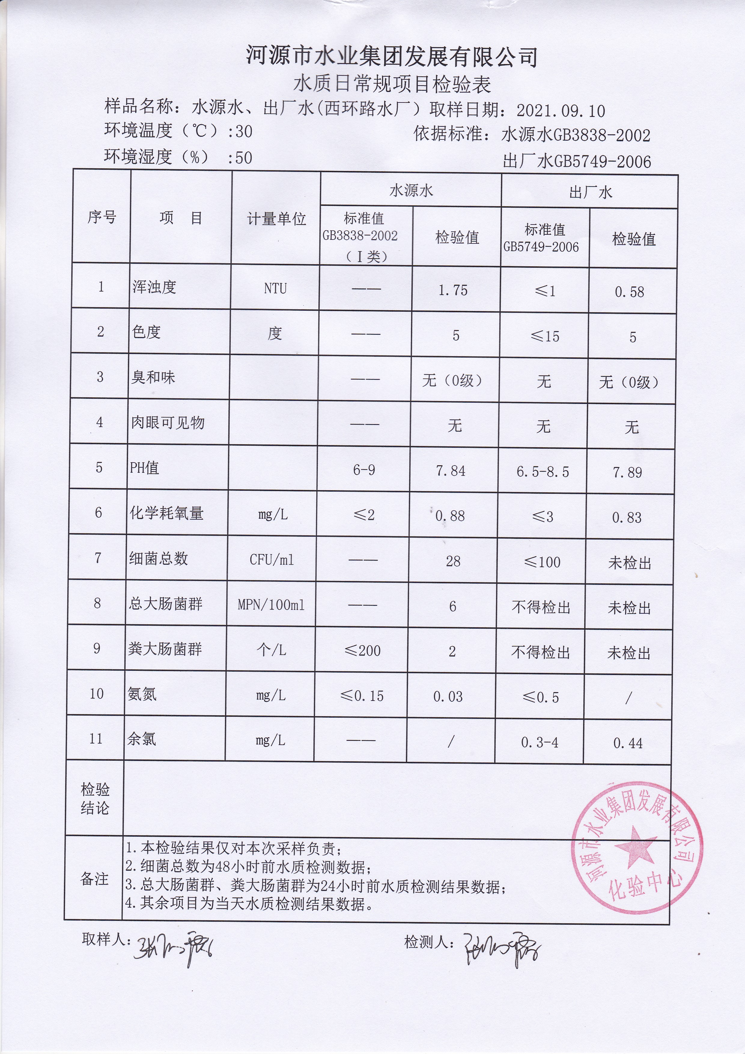 2021年9月10日水質(zhì)檢驗報告 ??