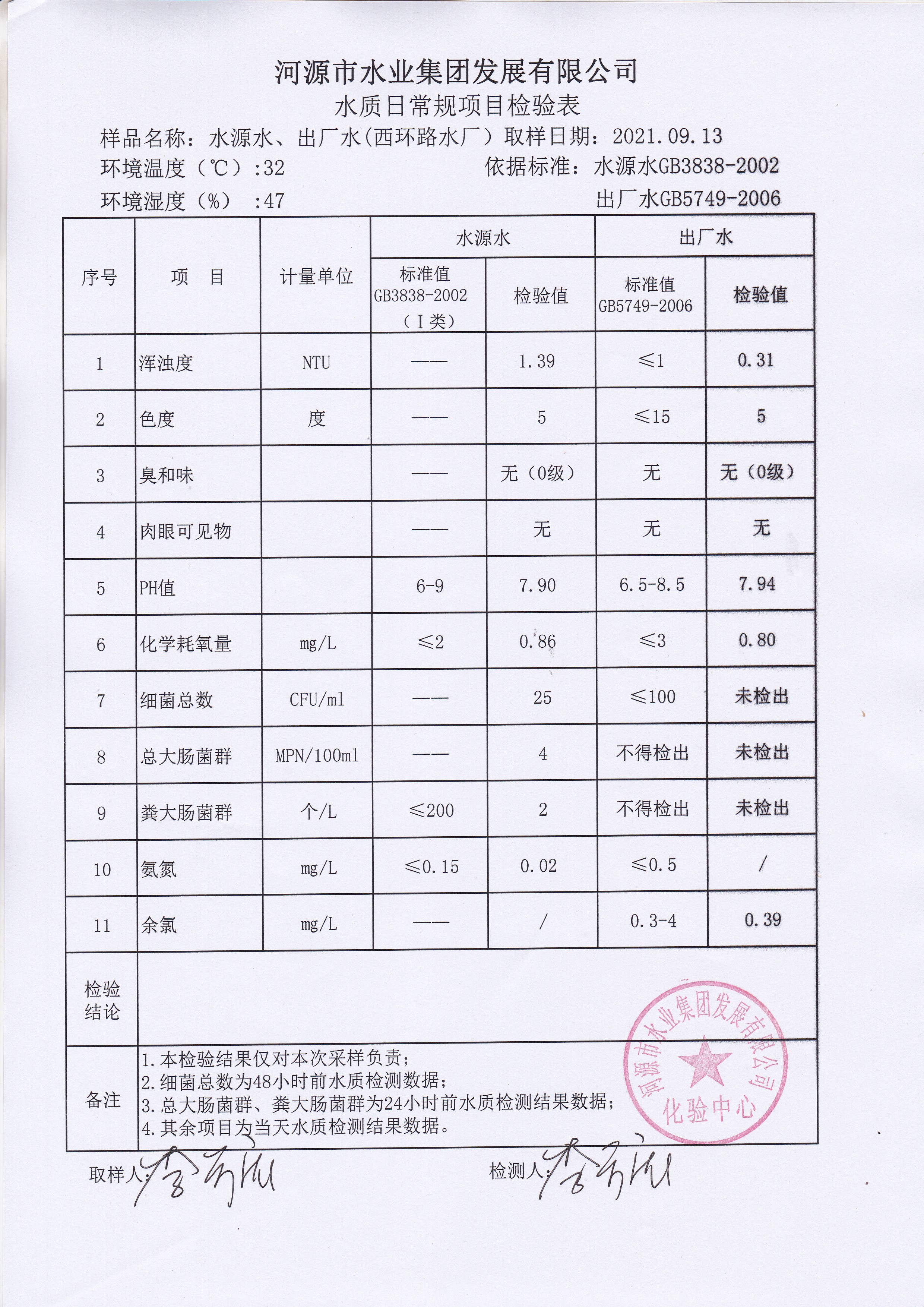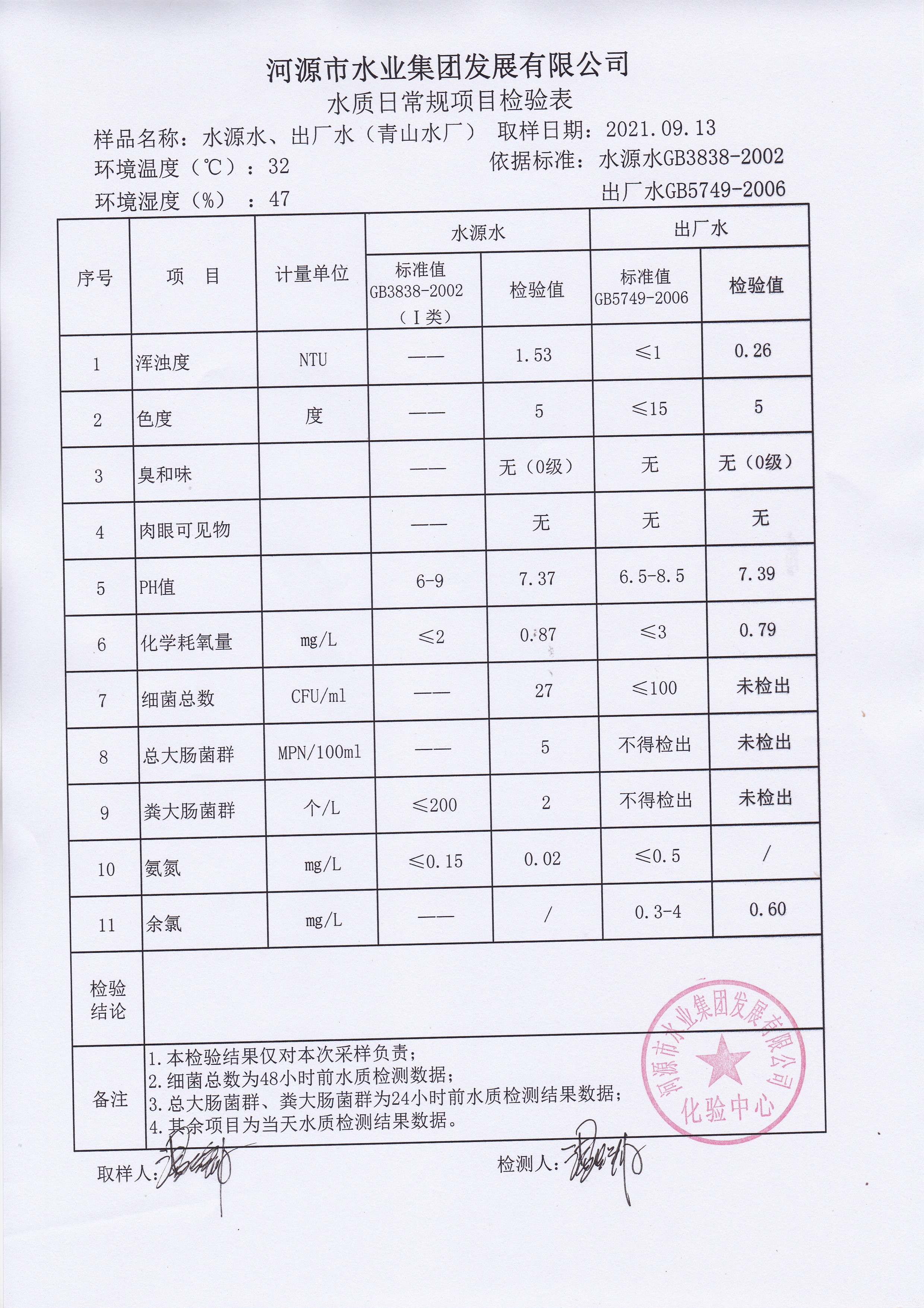 2021年9月13日水質(zhì)檢驗報告 ??