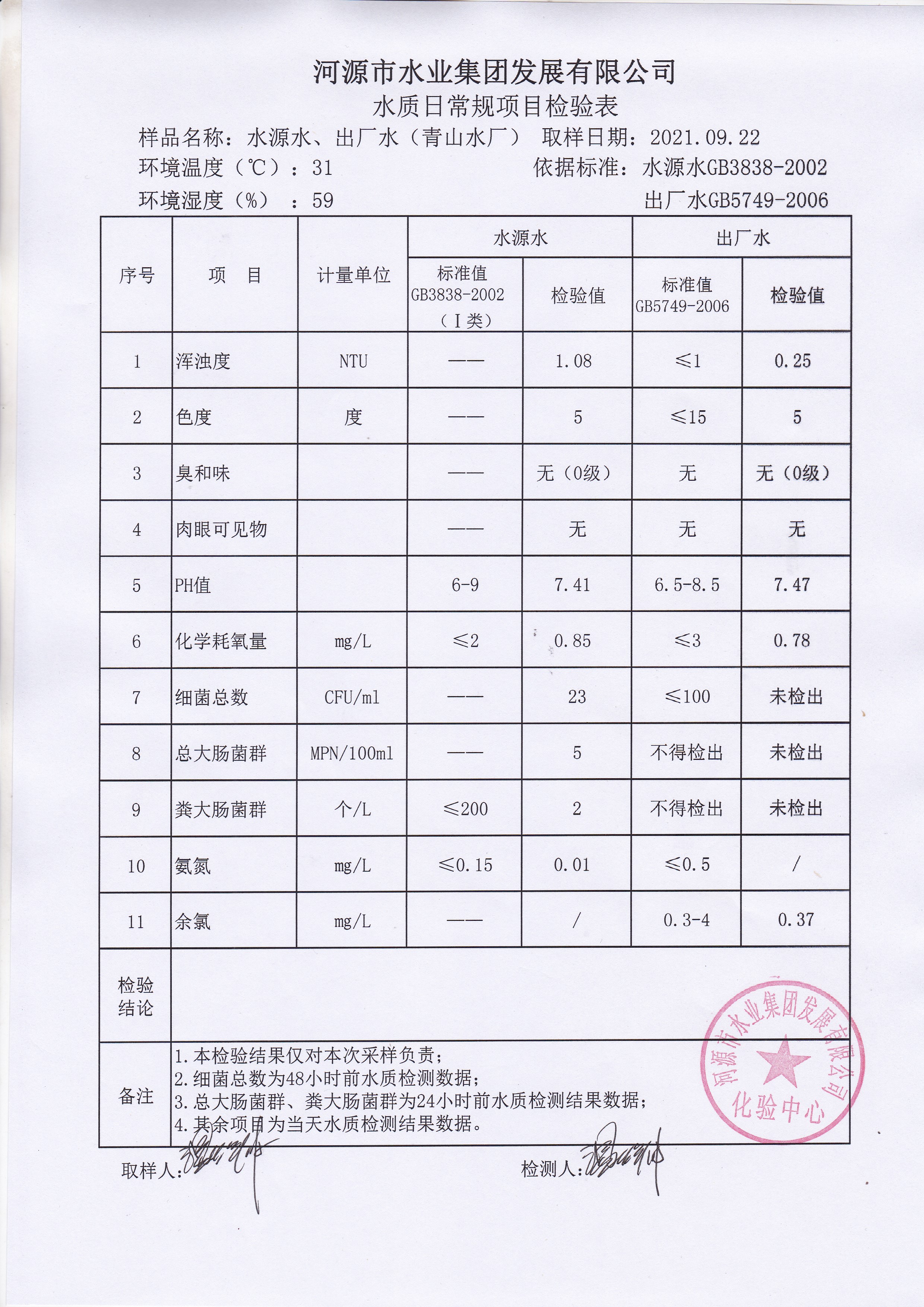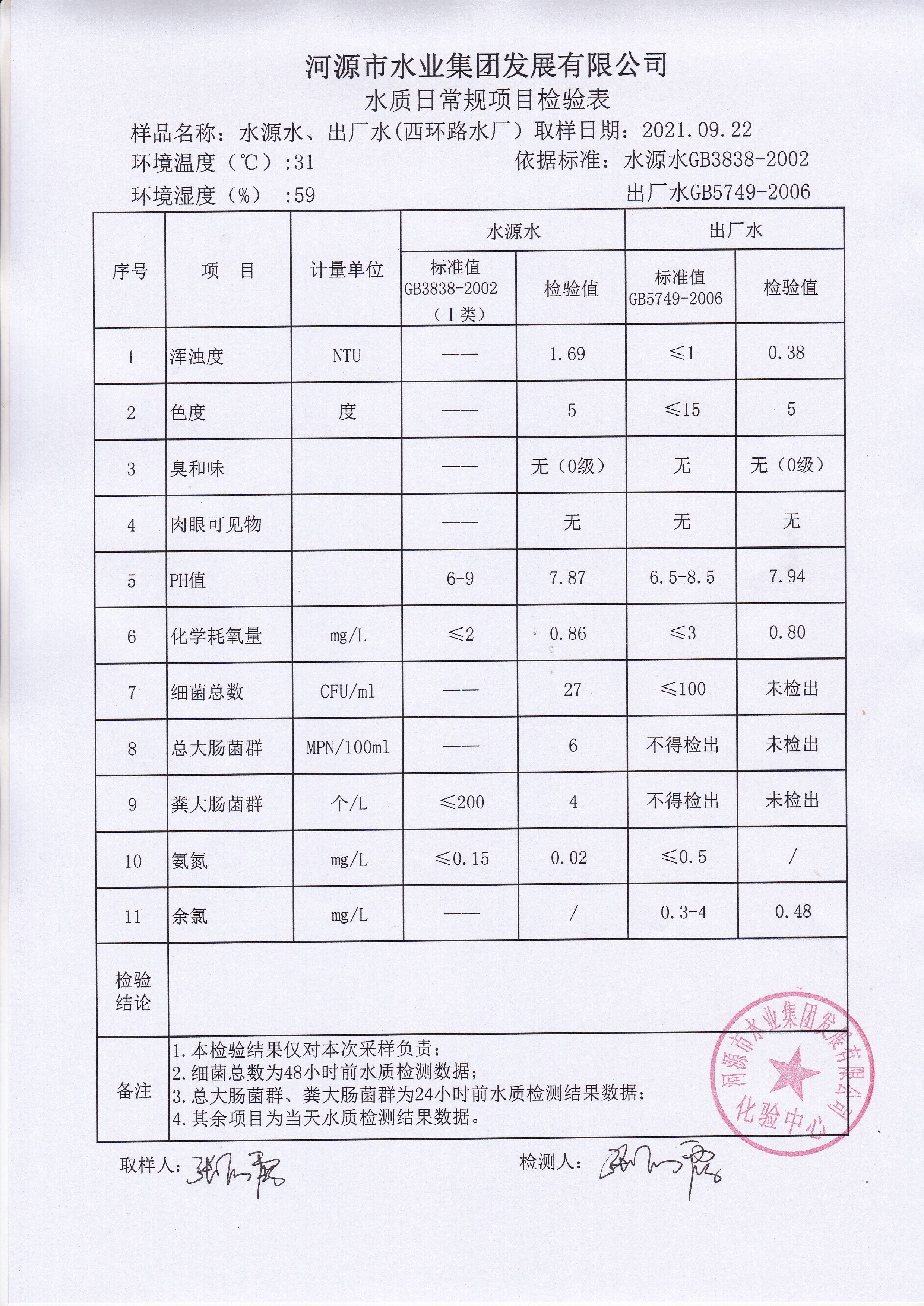 2021年9月22日水質(zhì)檢驗報告