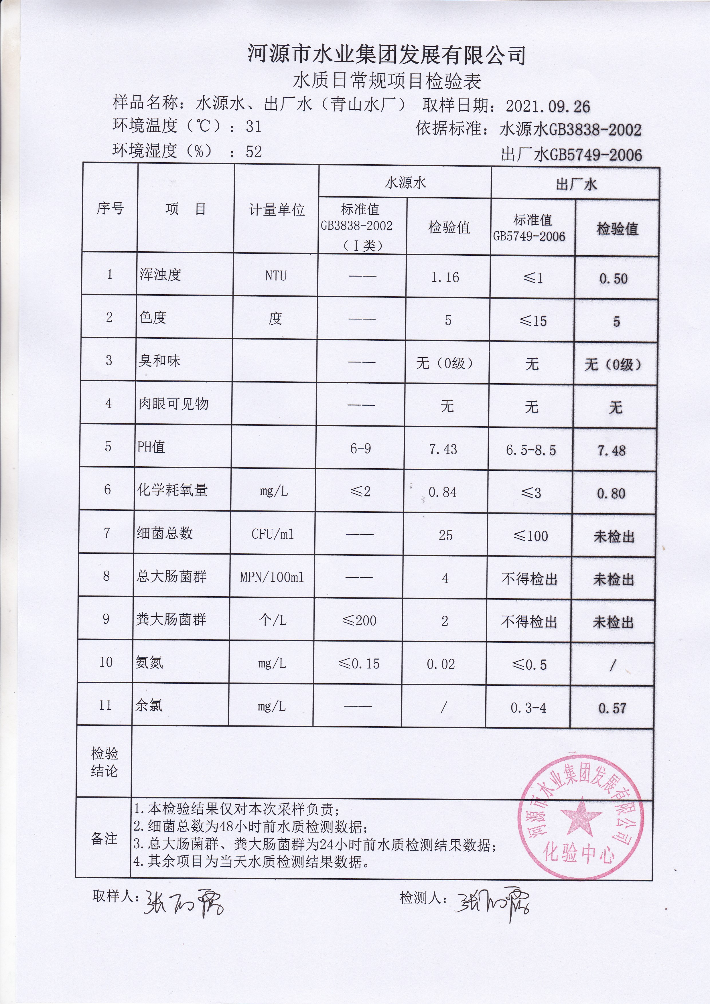 2021年9月26日水質(zhì)檢驗報告