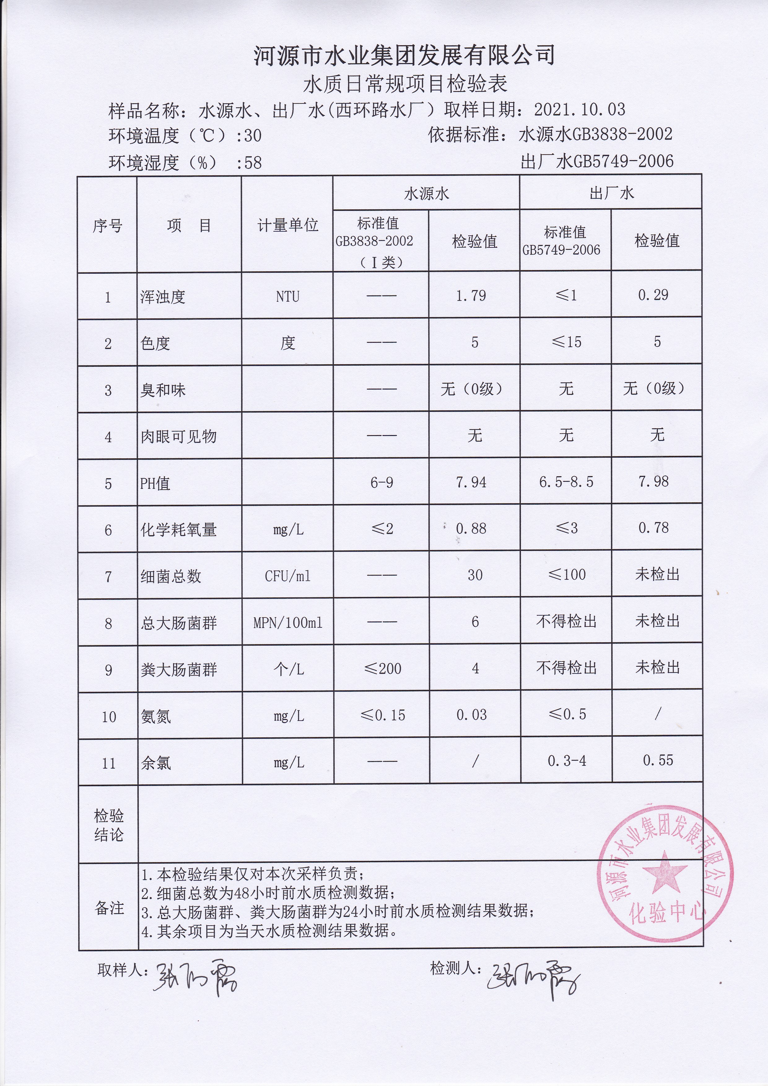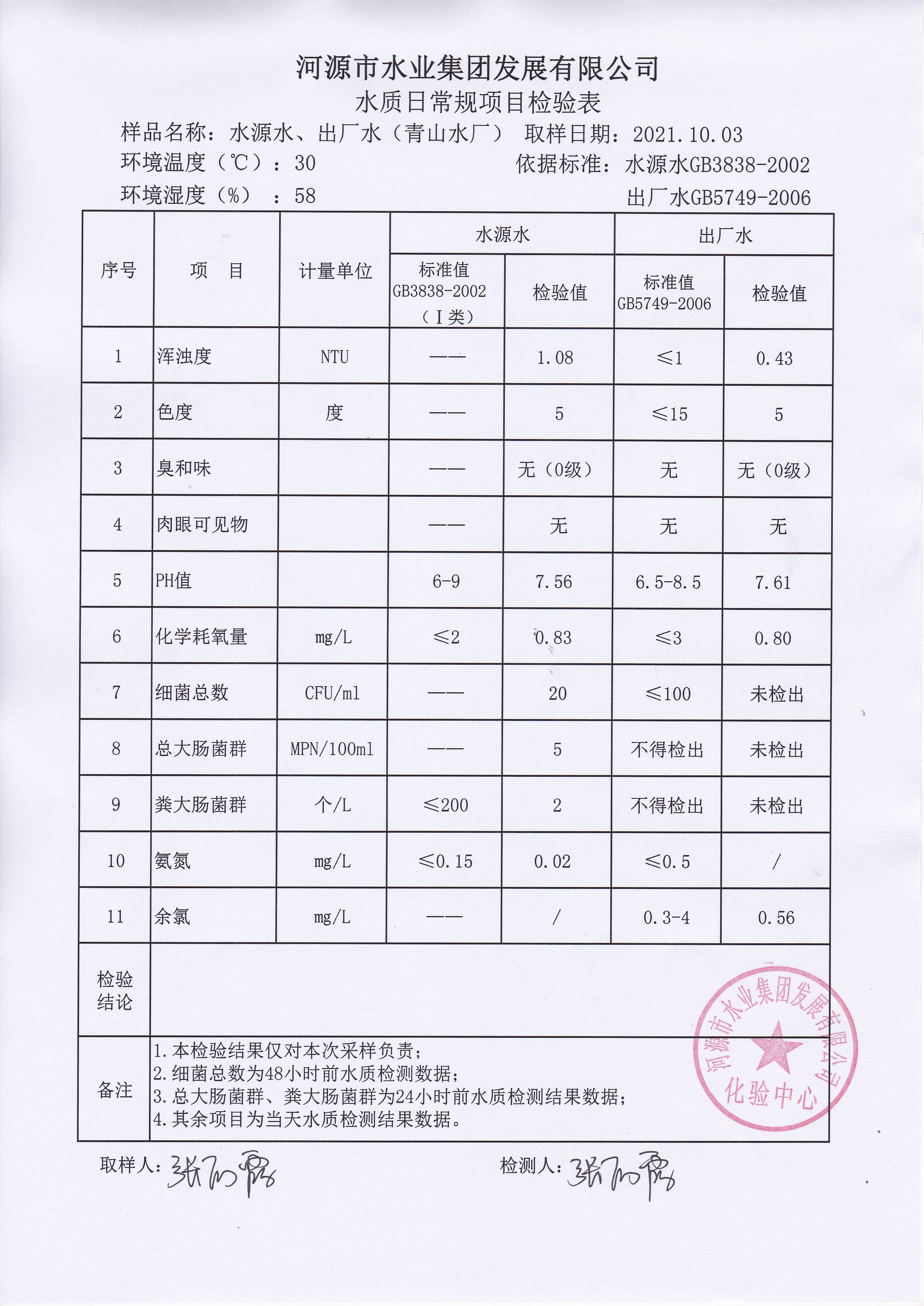 2021年10月3日水質(zhì)檢驗報告