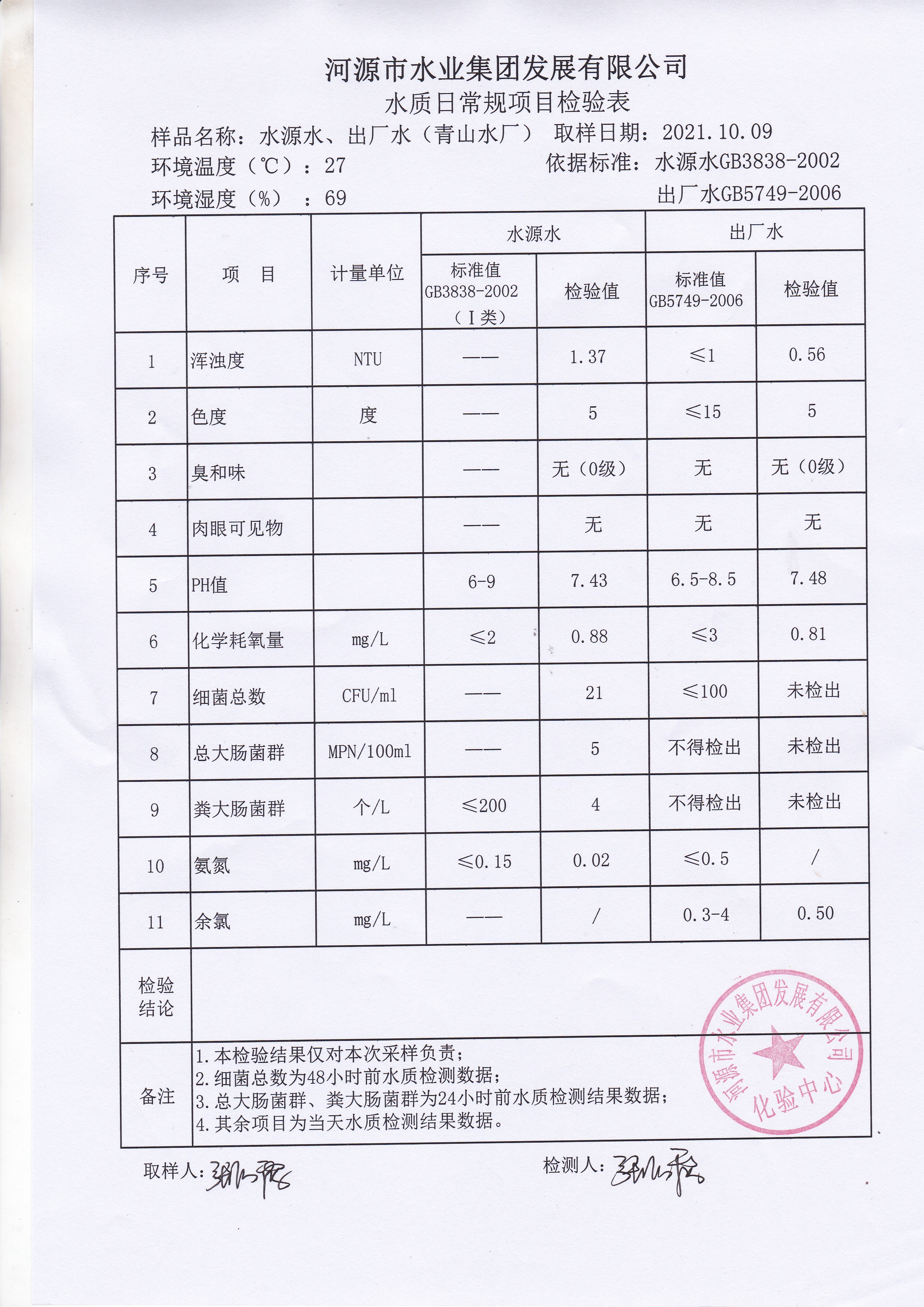 2021年10月9日水質(zhì)檢驗報告