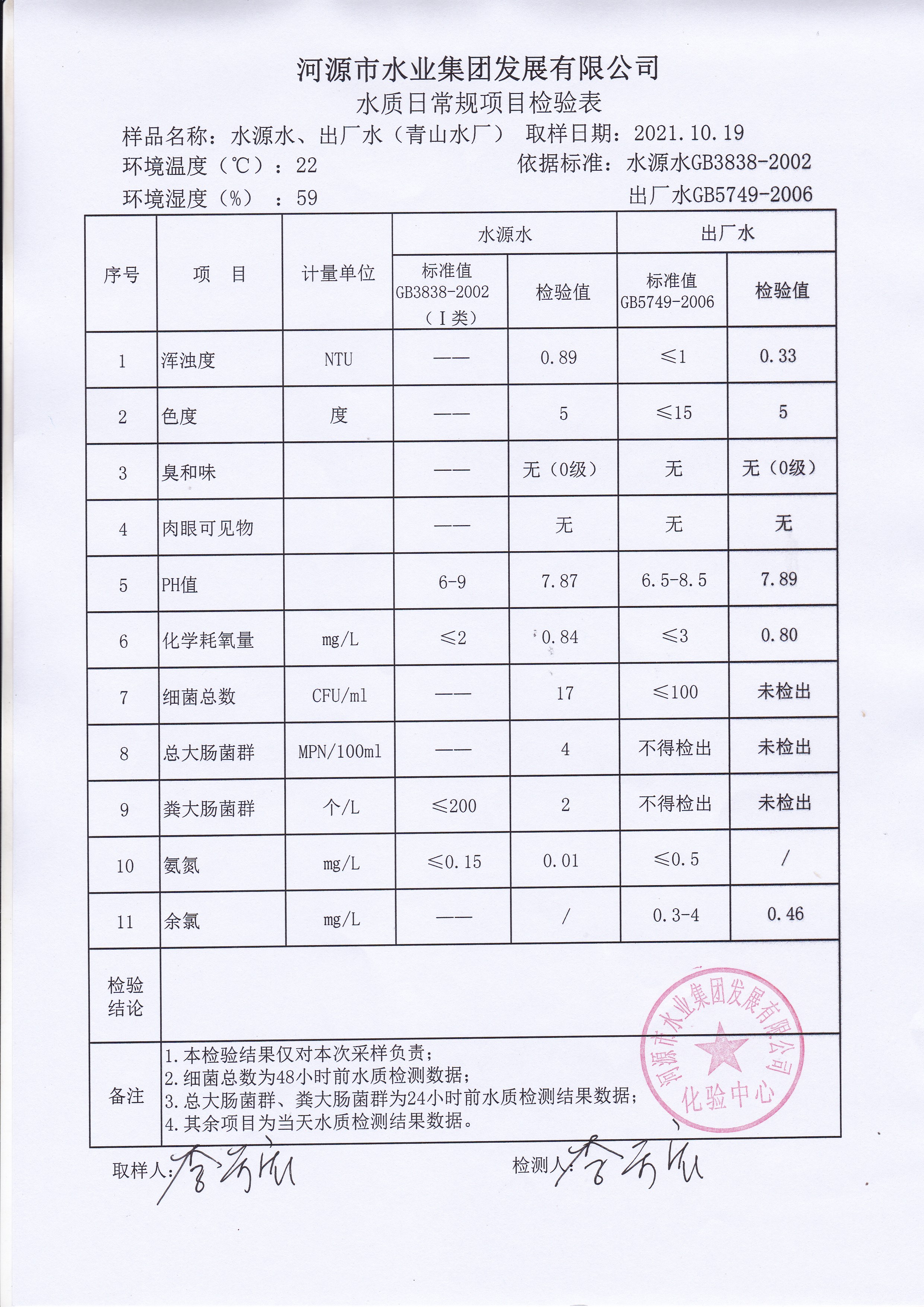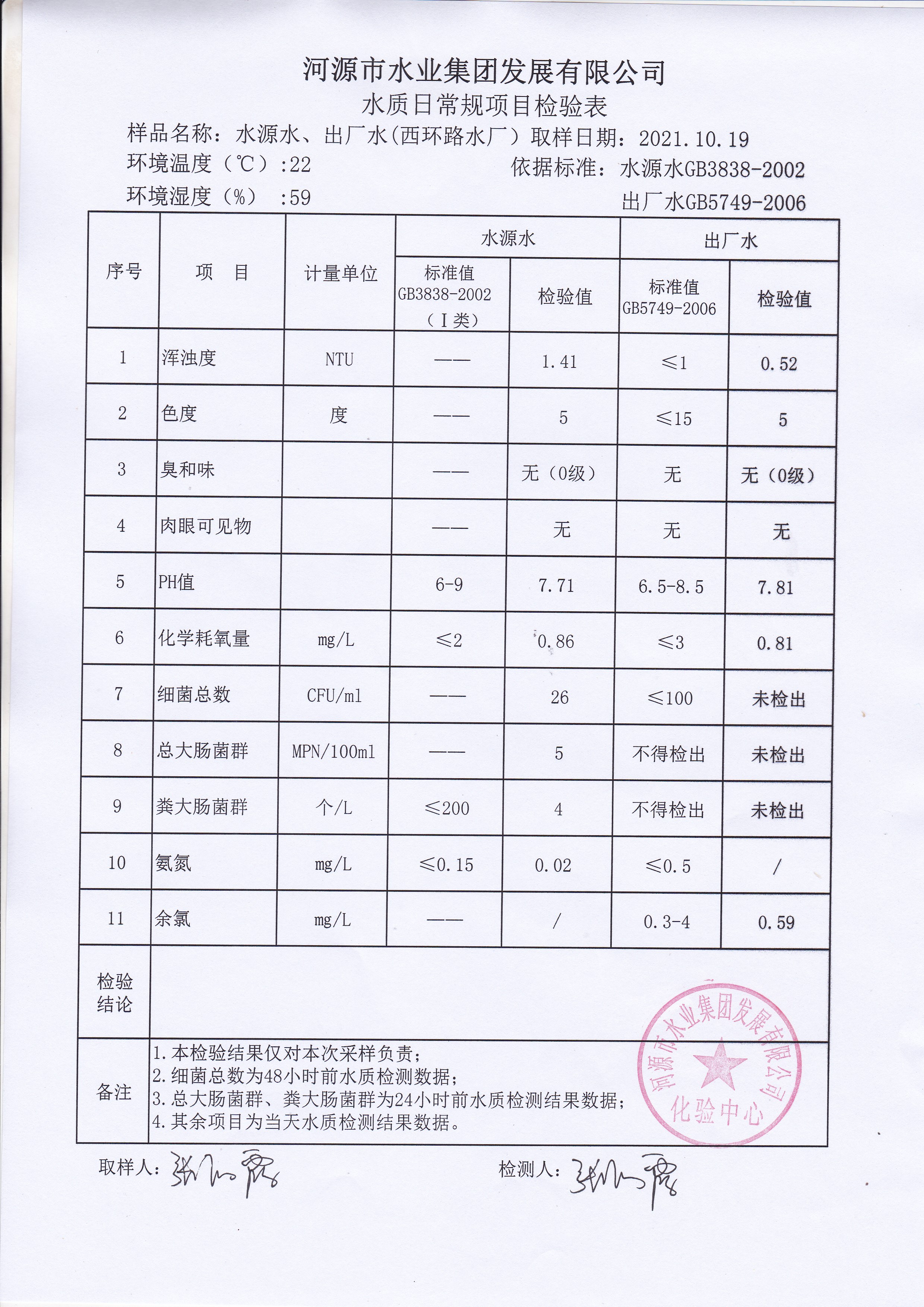 2021年10月19日水質(zhì)檢驗報告