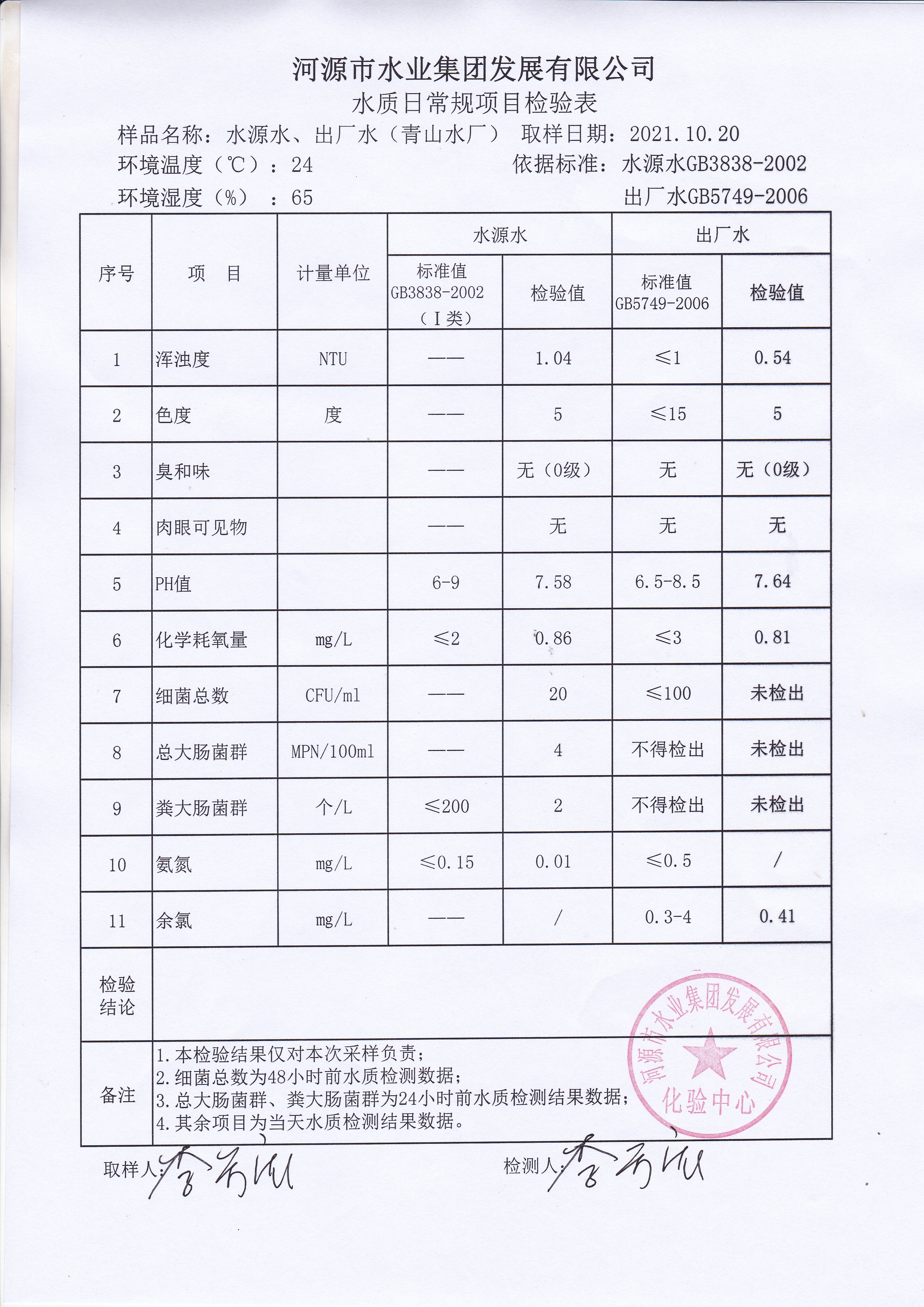 2021年10月20日水質(zhì)檢驗報告