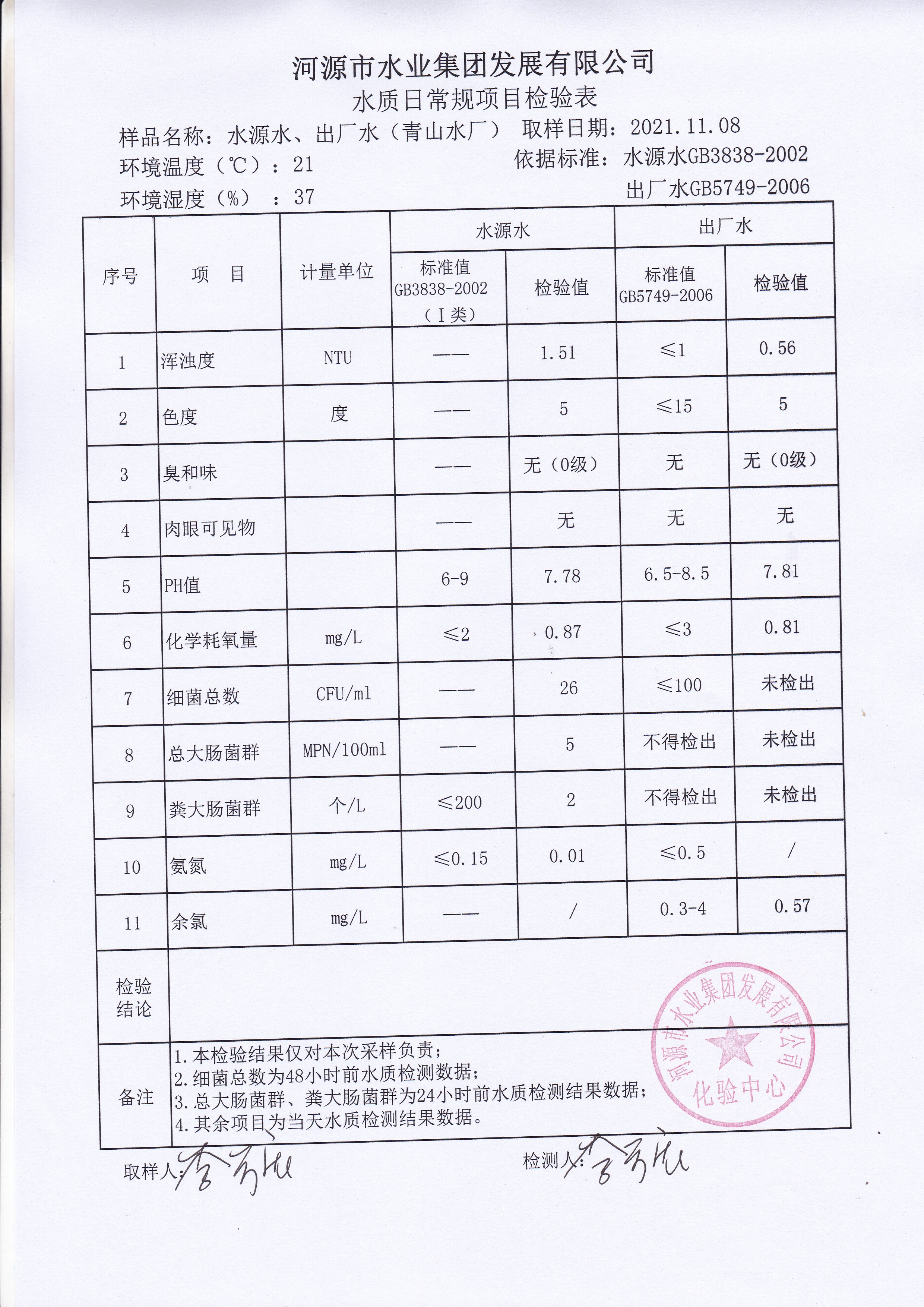 2021年11月8日水質(zhì)檢驗報告