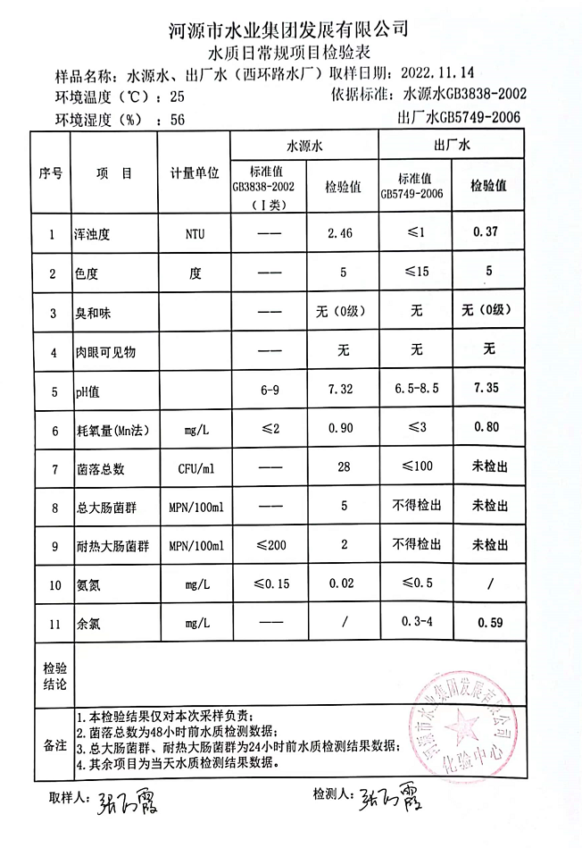 2022年11月14日水質(zhì)檢驗報告
