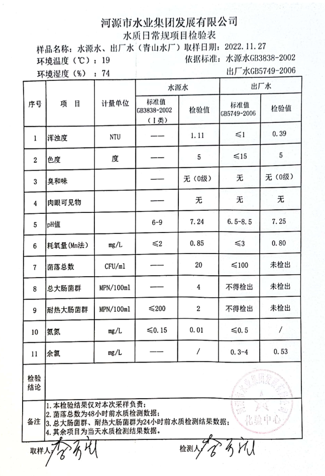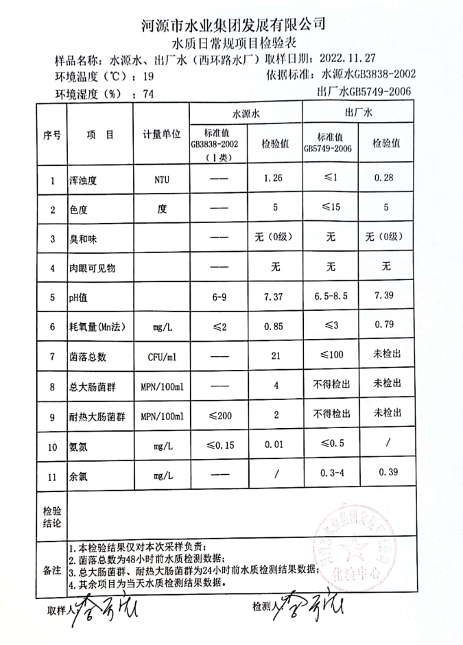 2022年11月27日水質(zhì)檢驗報告