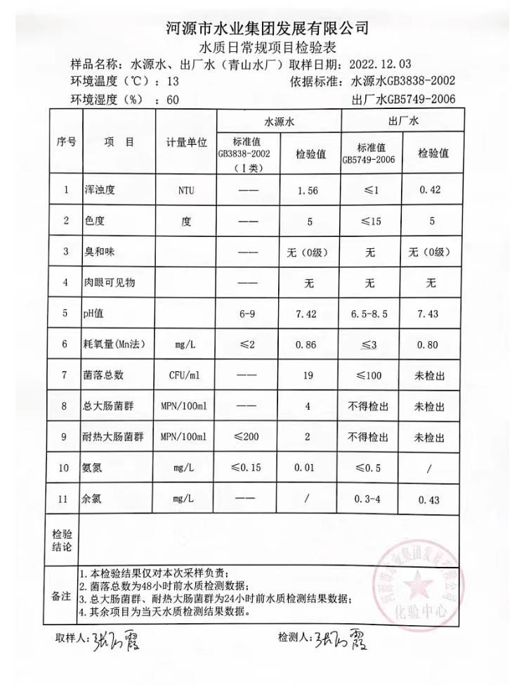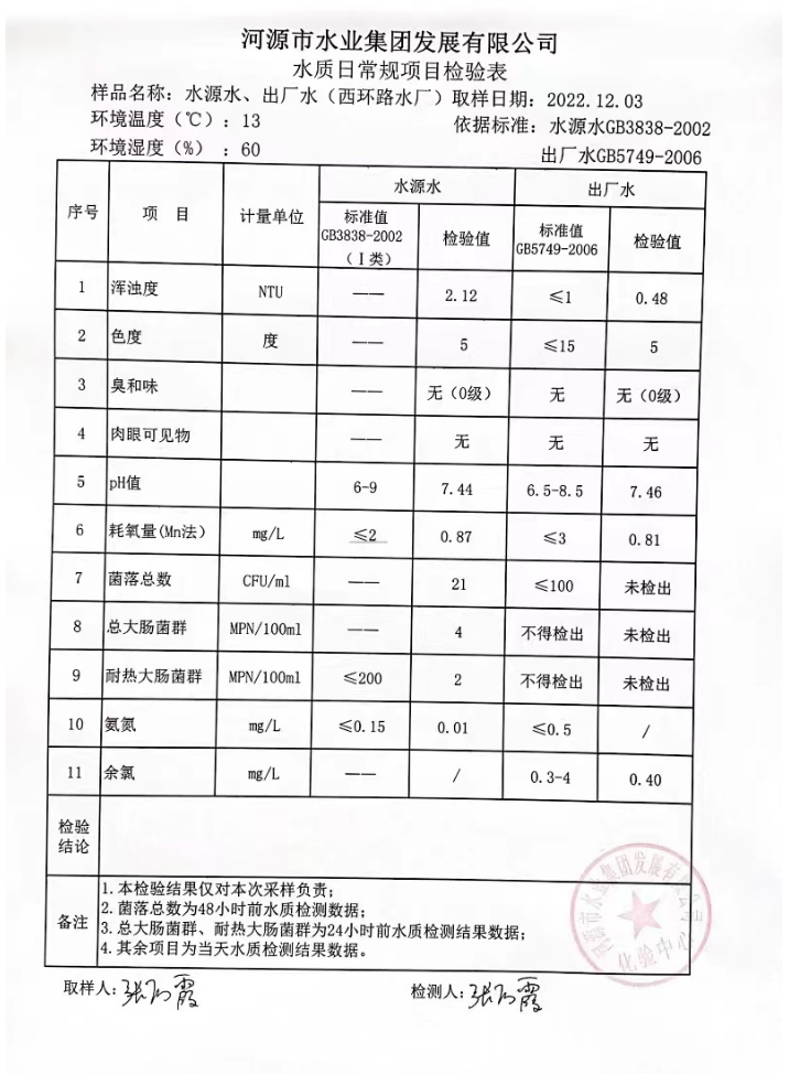 2022年12月3日水質(zhì)檢驗報告