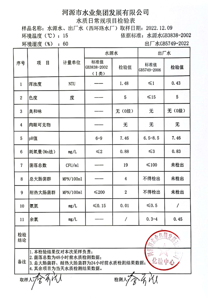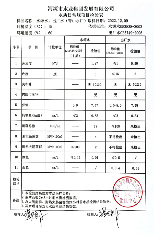 2022年12月9日水質(zhì)檢驗報告