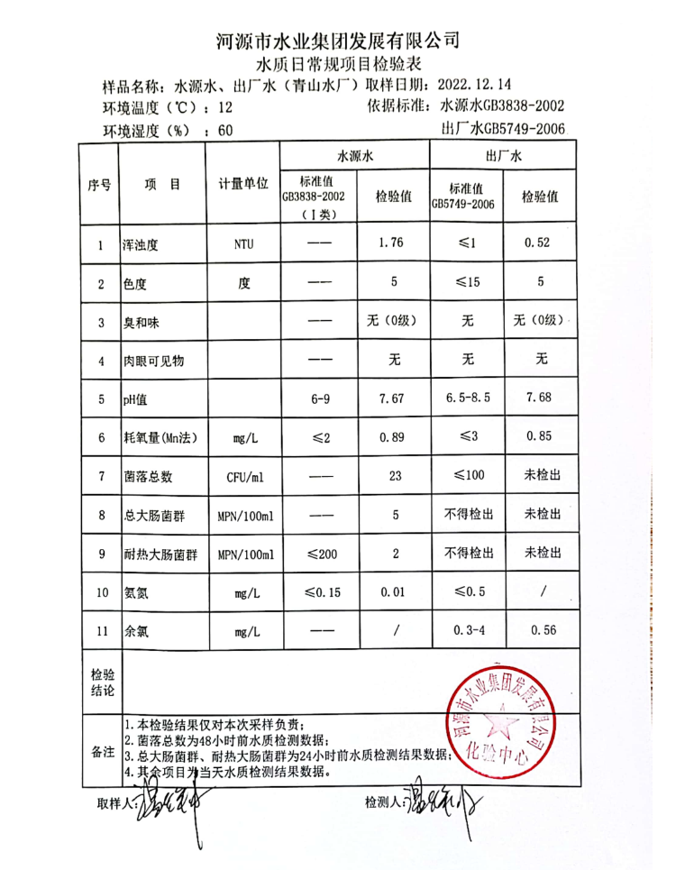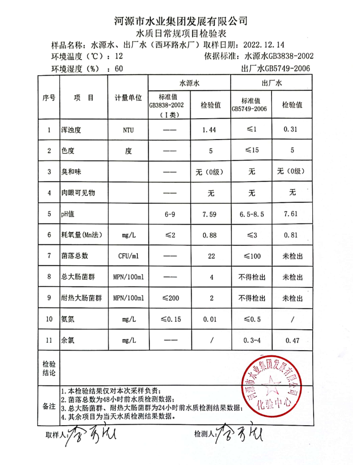 2022年12月14日水質(zhì)檢驗報告