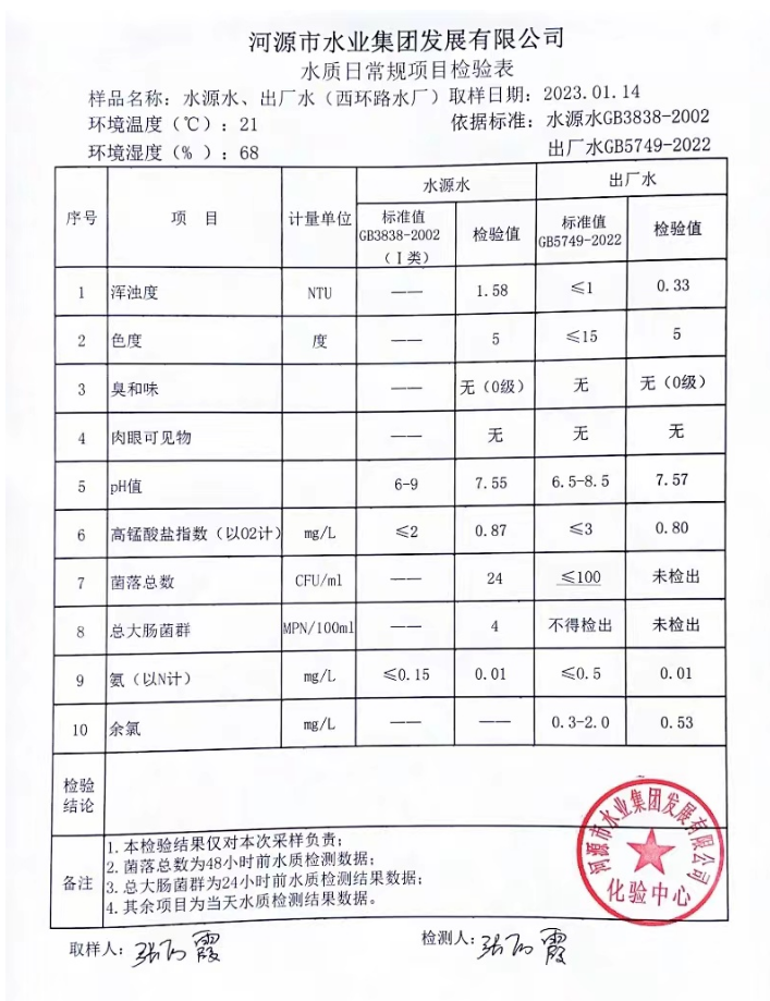 2023年1月14日水質(zhì)檢驗報告