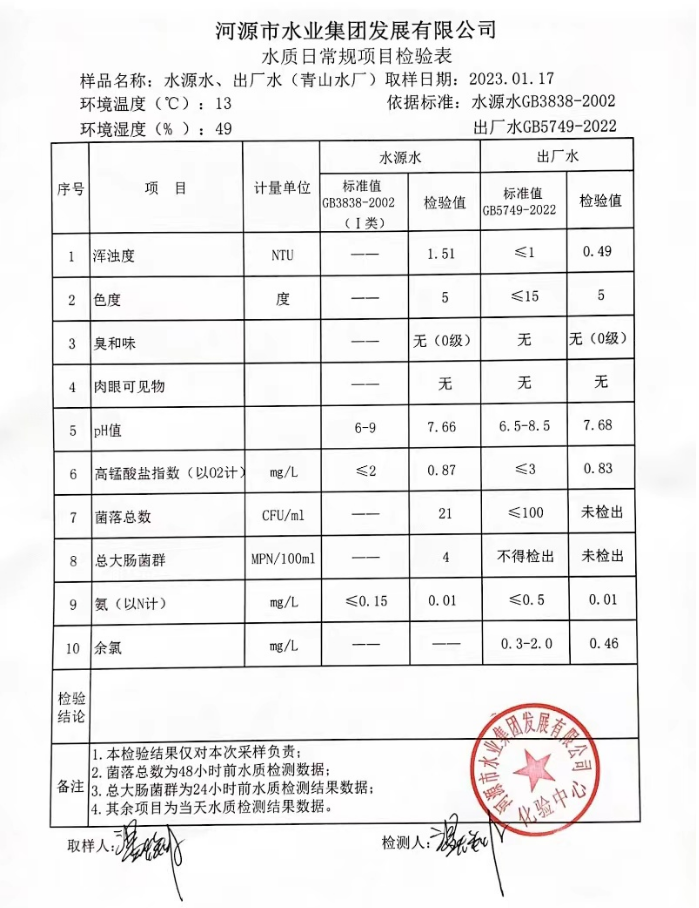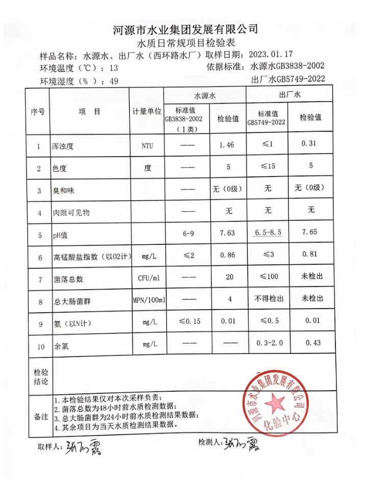 2023年1月17日水質(zhì)檢驗報告