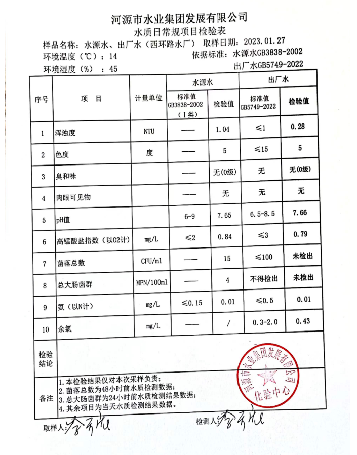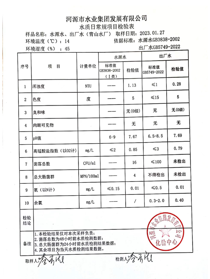 2023年1月27日水質(zhì)檢驗報告