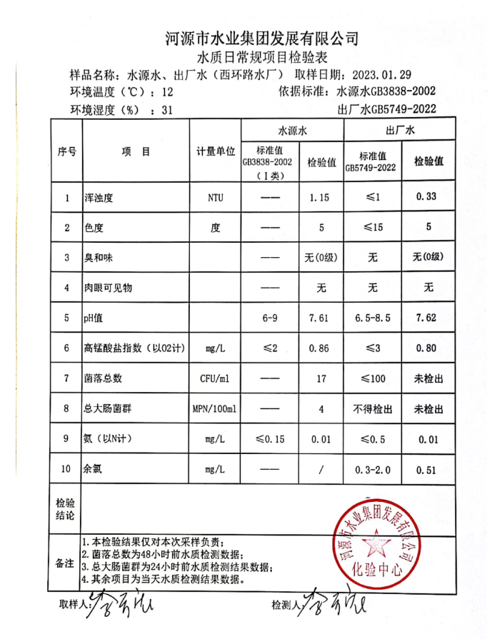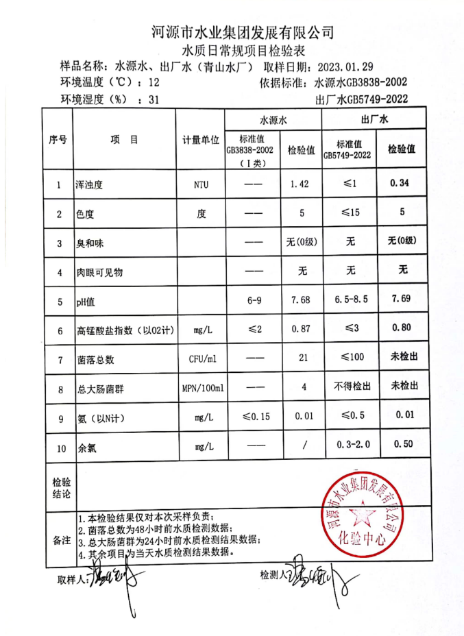 2023年1月29日水質(zhì)檢驗報告