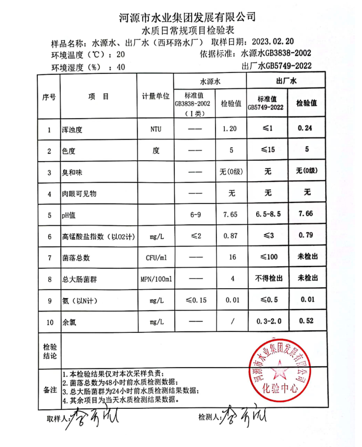 2023年2月20日水質(zhì)檢驗報告